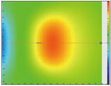 第四步:放置阵列于距离侧墙1 m的位置,以2 m为半径,由于阵列与侧墙的距离小于测量半径,因此对阵列外侧半圆空间内进行测量(见图31),光谱图如图32所示,颜色深浅程度表示声压级大小。