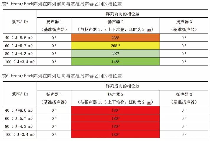 以3只扬声器为例,以第1、第3只扬声器为基准,分析阵列前向和后向相位情况。表5、表6分别为3只扬声器的40 Hz、60 Hz、80 Hz和100 Hz这4个具有代表性的频率,在阵列前向和后向与基准扬声器之间的相位差,并参照图1,通过颜色可直观地观察出叠加情况。