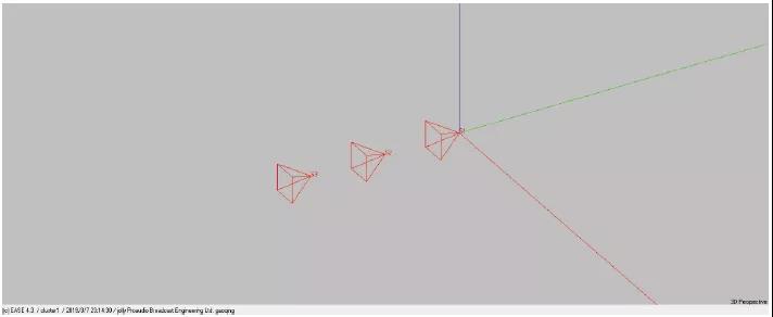 在EASE仿真软件中,添加3只扬声器(见图8),按上述理论分析设置阵列,阵列中扬声器拟控制的中心频率为80 Hz,扬声器间距为中心频率的1/4波长(即1.08 m),对距离舞台方向最近的扬声器加入6.3 ms的延时处理,对中间的扬声器加入3.1 ms的延时处理。