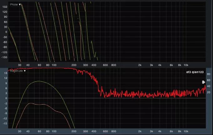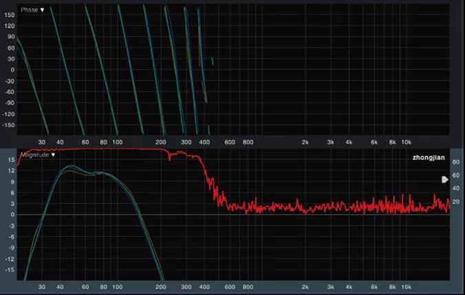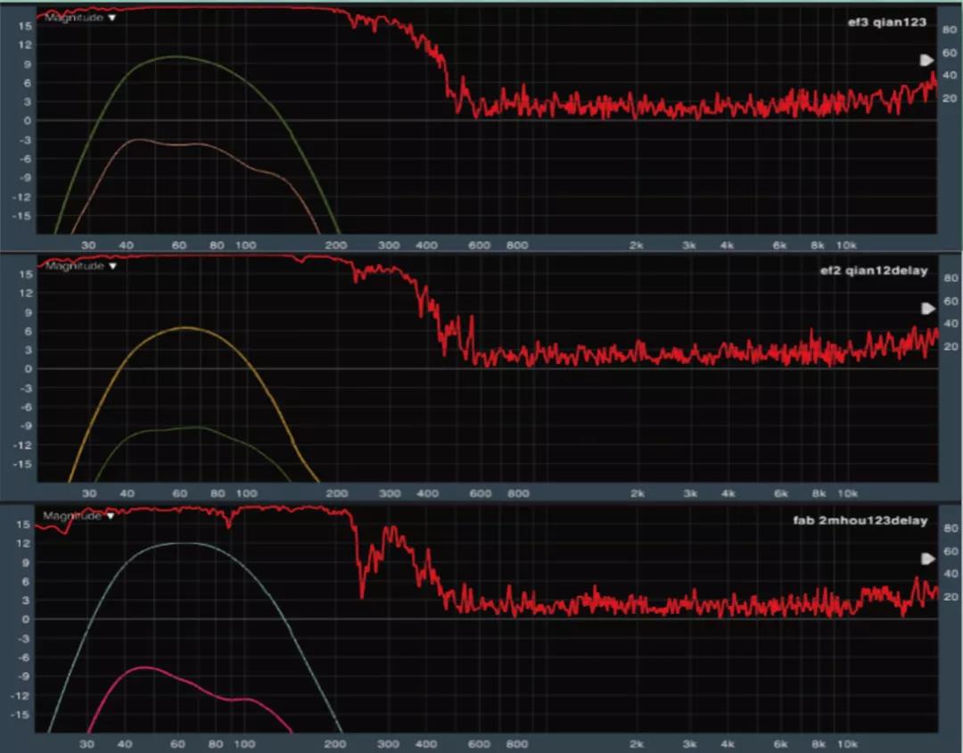 第四步:依次打开第2只、第1只扬声器,并且各加入3.1 ms(1/4波长对应的时间)和6.3 ms(1/2波长对应的时间)的延时,使3只扬声器的相位曲线重合。