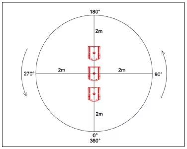 第二步:设置阵列。3只扬声器前后一字均匀摆放,如图15所示,扬声器的间距为中心频率的1/4波长,本次实验扬声器的中心频率为80 Hz(波长约为4.3 m),因此扬声器的间距为1.1 m。