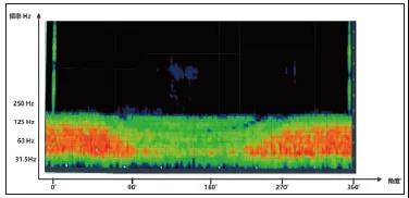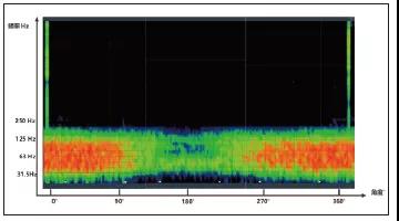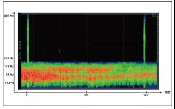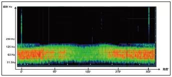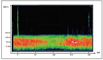 从阵列的前方开始(0°方向),发出一个脉冲信号,手持测试传声器,以阵列为圆心,半径为2 m逆时针绕圆测量,结束一周的环绕测试后再发出一个脉冲信号,测试结束。图17为测量角度示意图,图18为实验光谱图,其中颜色的深浅程度标志声压级大小。