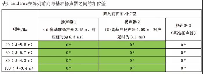 End Fire阵列在进行设置时,将测量点布置于观众席内,并以靠近舞台方向的最后一只扬声器为基准,依次向前(观众席)测量每只扬声器与基准扬声器的时间差,并据此在其处理通道设置相应的延时,使每只扬声器等效重叠在基准扬声器上,保证每只超低音扬声器辐射的声音到达测试点的时间相同,即所有扬声器在阵列前向同相,相位差为0,这样做可以使在观众方向的超低音扬声器阵列的能量叠加,声压级根据扬声器数量的叠加而逐步叠加。