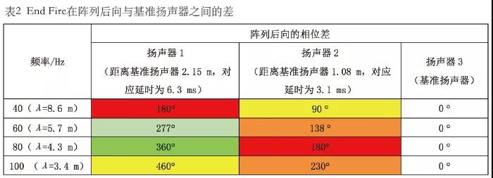 以3只扬声器组成的End Fire阵列为例,见图3,在阵列前向(观众区),3只扬声器声压级会增加约9 dB;而在阵列后向(舞台方向),扬声器可用频带内相位关系大多位于120~240°之间,总体能量是相对抵消的。具体分析其中心频率80 Hz左右的相位情况,以离舞台最近的扬声器为基准,第2只扬声器加入延时处理之后与第3只扬声器所辐射声波的相位差为180°,第1只扬声器与第2只扬声器所辐射声波的相位差同为180°,因此扬声器1与扬声器2、扬声器2与扬声器3在中心频率的相位是互相抵消的。3只扬声器的40 Hz、60 Hz、80Hz和100 Hz共4个具有代表性的频率,在阵列前向和后向与基准扬声器之间的相位差见表1、表2,并参照图1,通过颜色可直观地观察出叠加情况。