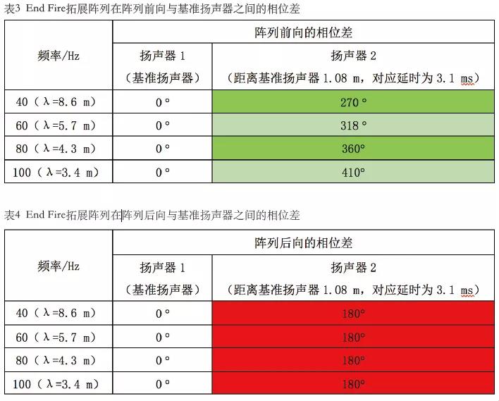 图4为扬声器数量为2只的End Fire拓展阵列示意图,以离观众区最近的扬声器为基准,分析阵列前向和后向相位情况。2只扬声器的40 Hz、60 Hz、80 Hz和100 Hz这4个具有代表性的频率,在阵列前向和后向与基准扬声器之间的相位差见表3、表4,并参照图1,通过颜色可直观地观察出叠加情况。