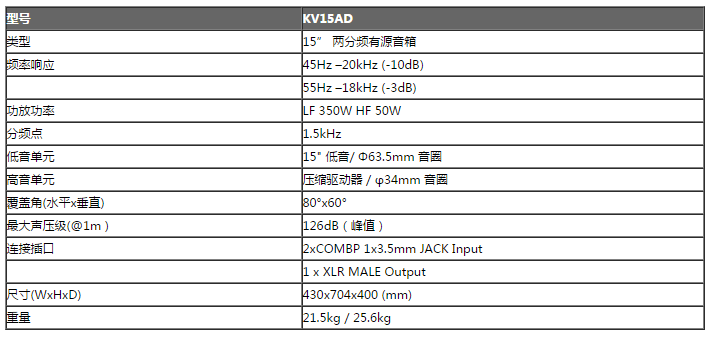 KV系列有源音箱低音采用铁氧体磁路材料,对称性磁路设计,音圈采用新型的耐高温材料,有利于大功率使用时的功率承受及散热;高音为压缩式驱动单元,Al膜片,音色细腻柔合;前级输入采用24bit 48kHz的DSP处理器,实现音效、三段均衡、低切、压限、延时、音量控制等功能,并带有液晶显示屏方便各功能参数调节。内置双功放电路,低音采用Class-D类音频功率放大,具有效率高、体积小、功率大、重量轻、性能稳定的优点,高音采用AB类音频功率放大,声音柔和清晰明亮。