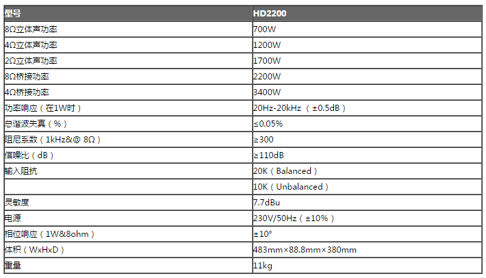 HD2200是一款2U高度电影还音放大器,开关电源部分采用两级软起动准谐振开关电源技术,保护电路简单有效,功放采用H类电路,输出改变传统的共发射极模式,不需要云母片绝缘,可有效提高散热效果, 可广泛应用在体育馆、剧院、文艺演出等。