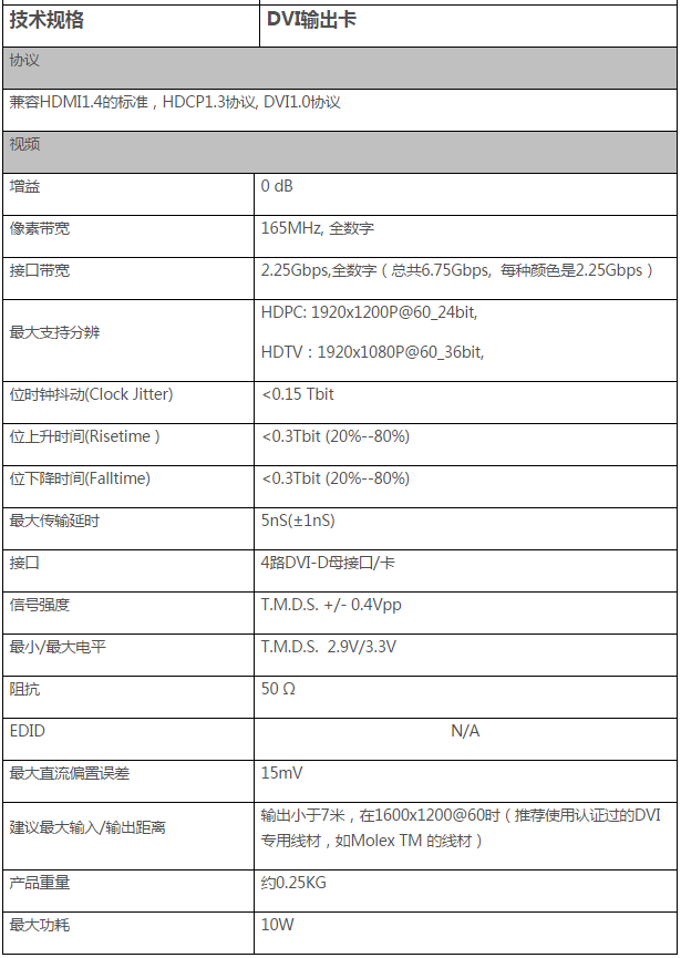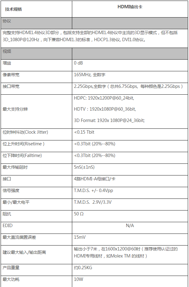 兼容HDMI1.4的标准,HDCP1.3协议, DVI1.0协议;